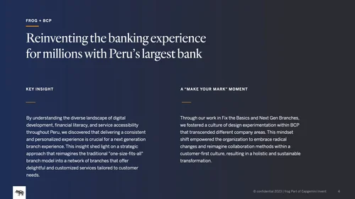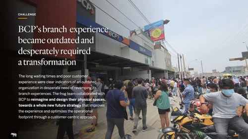 Despite having the biggest market share in the country, BCP’s branch experience had fallen behind and required significant upgrades. After conducting research and implementing strategies for convergent and organizational design, frog accompanied Banco del Crédito del Perú (BCP) to launch a new experience to own the leadership in Latin America’s banking experience.