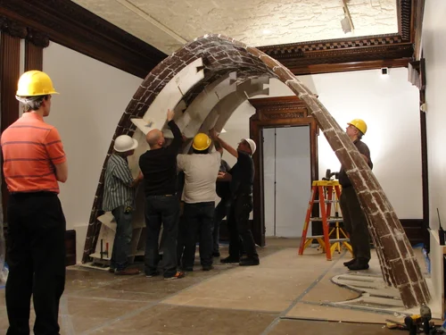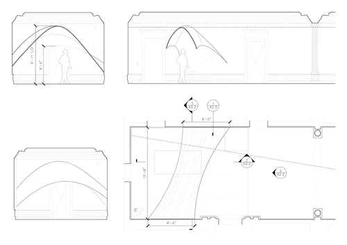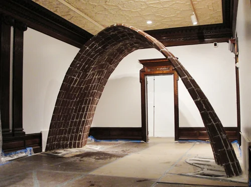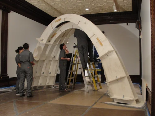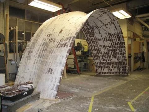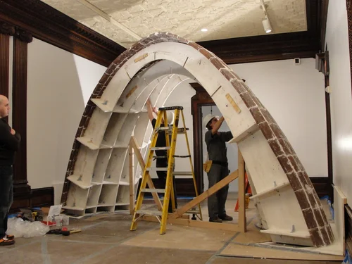 The vault was designed within specific constraints with a Grasshopper definition keeping the geometric catenary load paths within the 1.5" brick thickness and creating structural stability. The double curvature of the vault provided additional structural integrity.