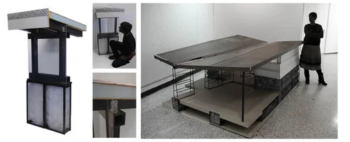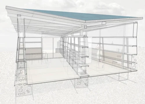 The gabion wall system consists of a flat-shipped steel frame which requires no on-site welding so the house is quickly and easily fabricated. All parts of this architectural proposal were built at 1/2 scale to demonstrate feasibility and material assembly.