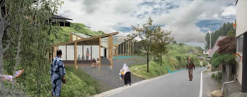 Kitsune Bamba acts as an Onsen, the traditional Japanese community baths, and emergency center with kitchens, laundry facilities and gathering spaces.