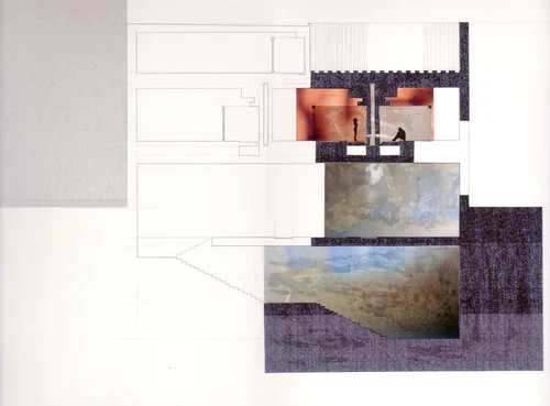 Material studies with molded wax and felt were photographed then collaged into the hand-drawn architectural plans and sections to represent the desired moods and atmosphere within specific places.